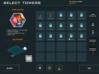 the Tower select that is a menu that appears before every mission in the game what this does is allows players to select from an inventory of towers and allows them to bring in up to 4 towers of their choosing this is a way of limiting players to be more tactical about their choices as players maybe am not able to unlock up to 15 towers they may only bring in a set number to that of certain arenas. this is to encourage tactical play from players instead of giving the players all the towers to choose from and allowing them to put them down the player must be tactical in their thinking and shoes the towers that will greatly help them in the current level as well this adds another layer of player progression as they will see through the more they play the game the more towers there will be able to unlock.